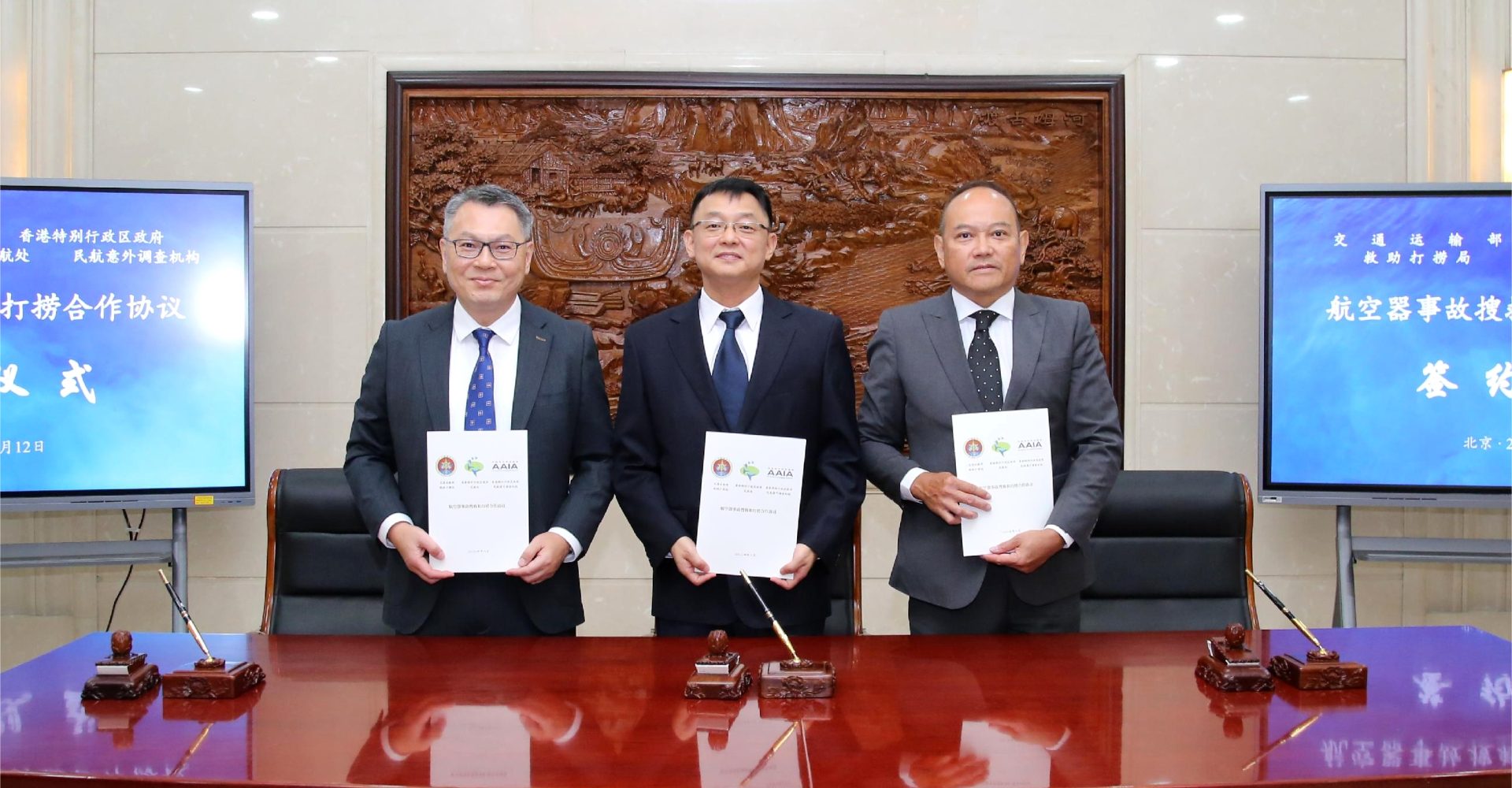 中國交通運輸部救助打撈局局長王雷、香港民航處處長廖志勇、香港民航意外調查機構的總意外及安全調查員文家齊,今日在北京簽訂新的《航空器事故搜救和打撈合作協議》。