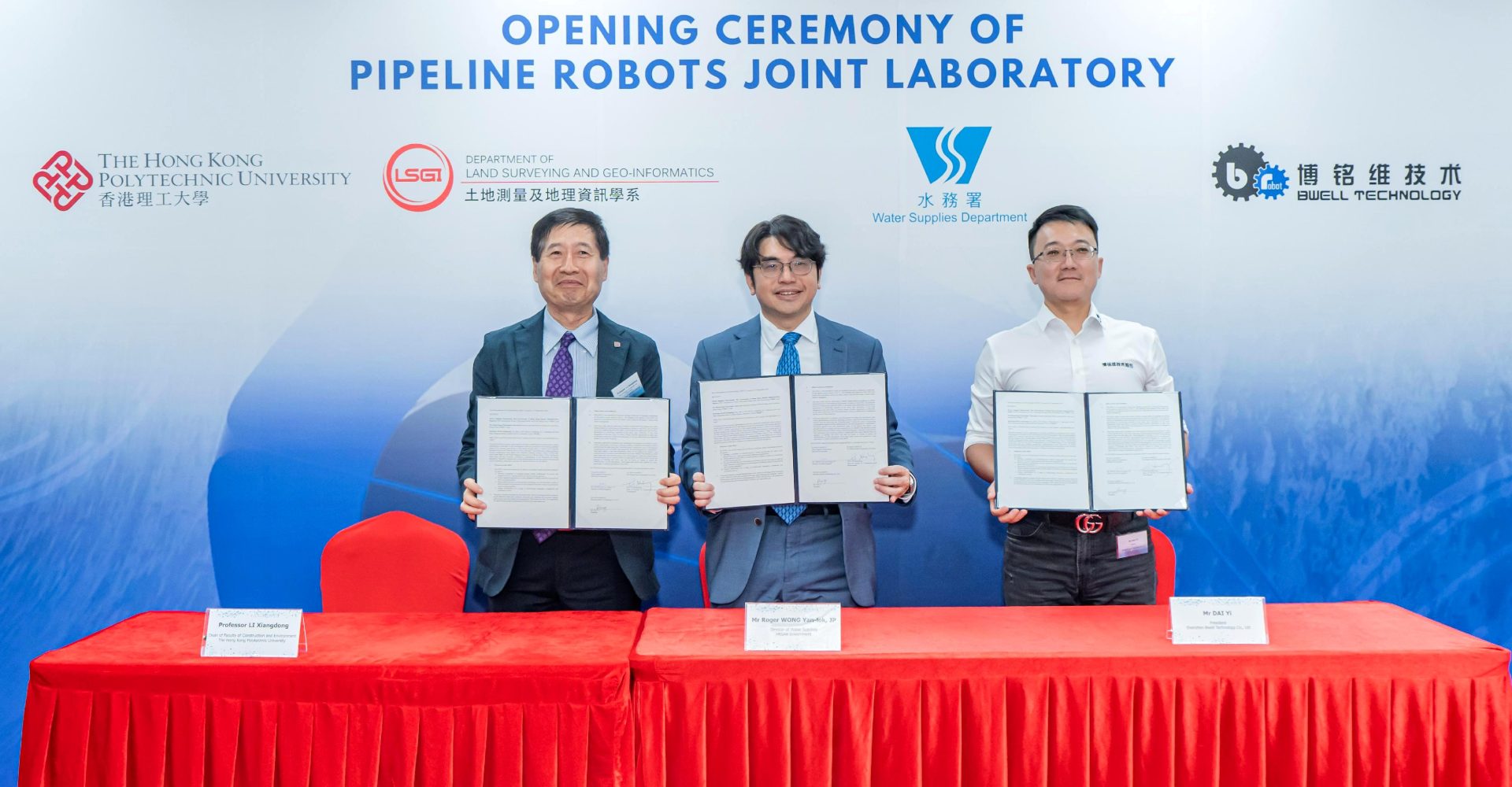 主圖片:水務署與香港理工大學及深圳市博銘維技術股份有限公司簽訂合作備忘錄,共同開發水管檢測機械人技術。左起:香港理工大學建設及環境學院院長李向東教授、水務署署長黃恩諾、深圳市博銘維技術股份有限公司總裁代毅。