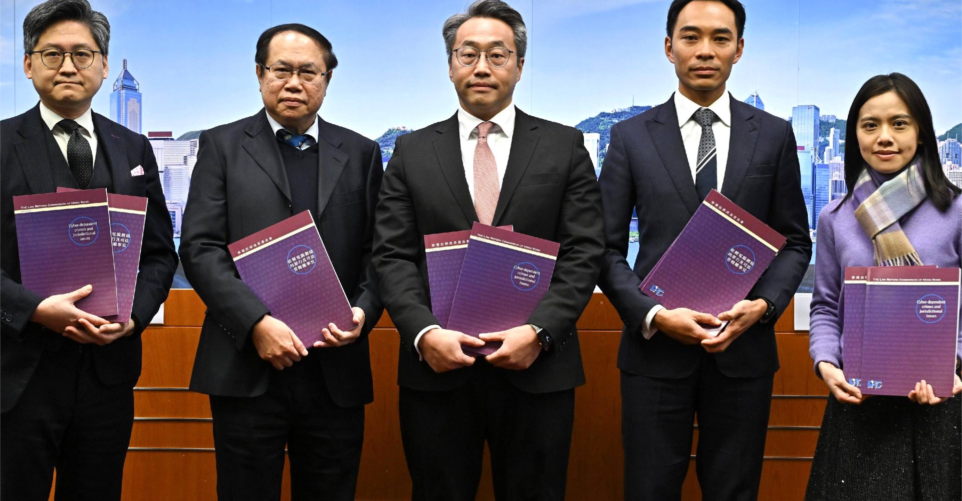 主圖片:法律改革委員會轄下電腦網絡罪行小組委員會主席陳政龍資深大律師(中)、小組委員會成員鄒錦沛博士(左2)和鄧子揚(右2)、法改會秘書長黃惠沖資深大律師(左1)和小組委員會秘書卓芷穎(右1),出席記者會,發表《依賴電腦網絡的罪行及司法管轄權事宜》報告書。(來源:政府新聞處)