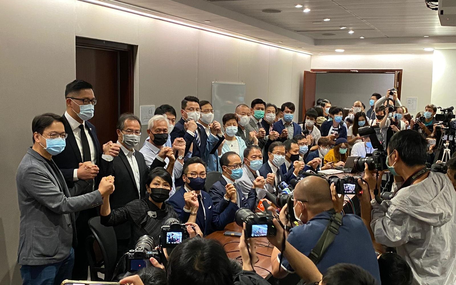 全國人大常委會昨(11日)作出《決定》,專業議政梁繼昌,以及公民黨楊岳橋、郭榮鏗、郭家麒,經「依法認定」不符合擁護《基本法》和效忠特區,即時喪失立法會議員資格。全體民主派議員不滿中央決定總辭,民主派會議召集人、民主黨主席胡志偉聯同黨友尹兆堅、林卓廷、黃碧雲,今(12日)午向秘書處遞交合共7封民主黨議員的辭職信。