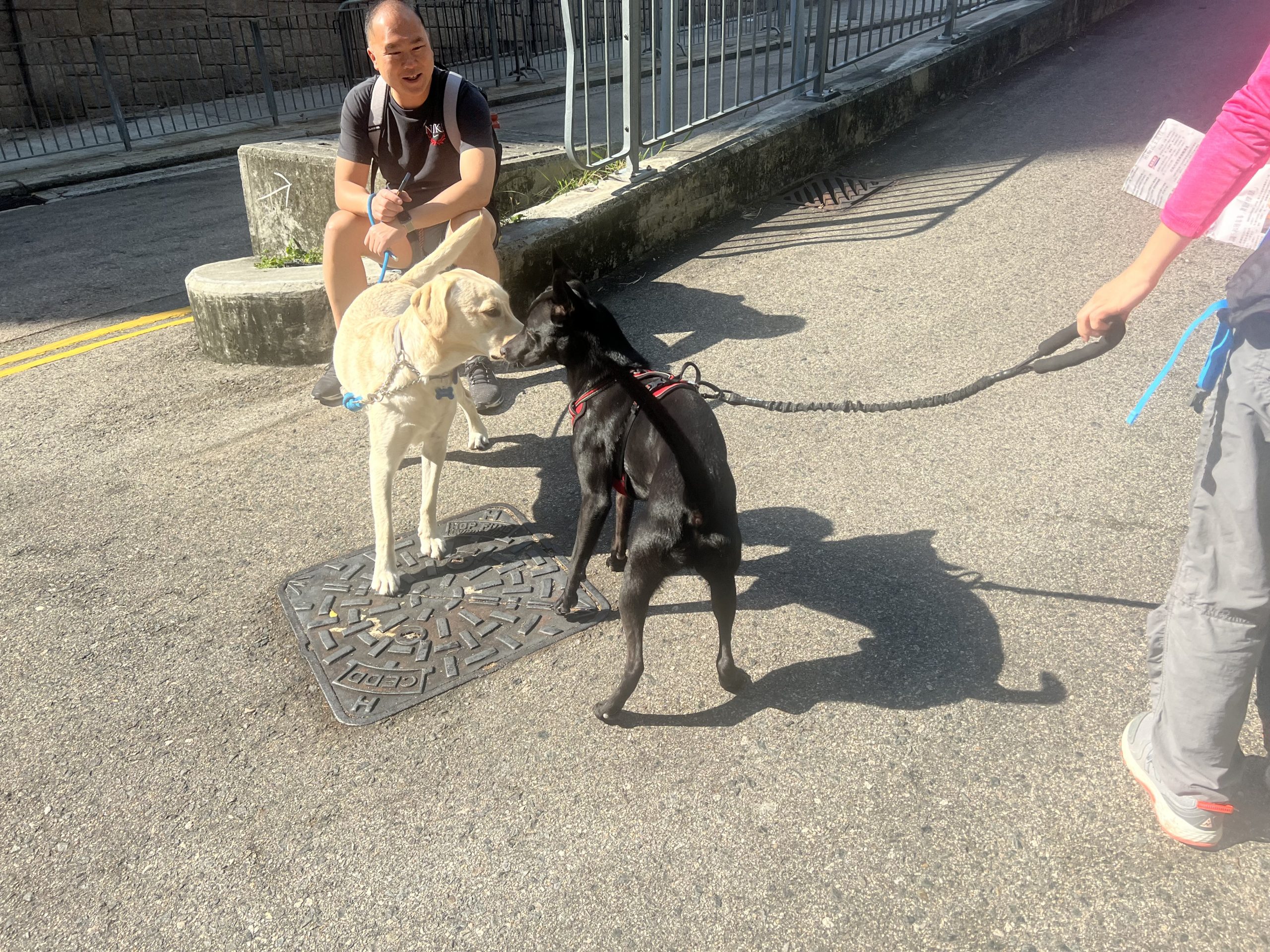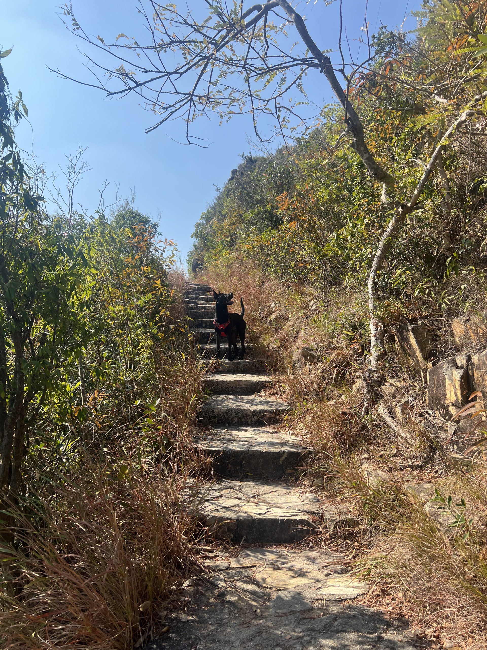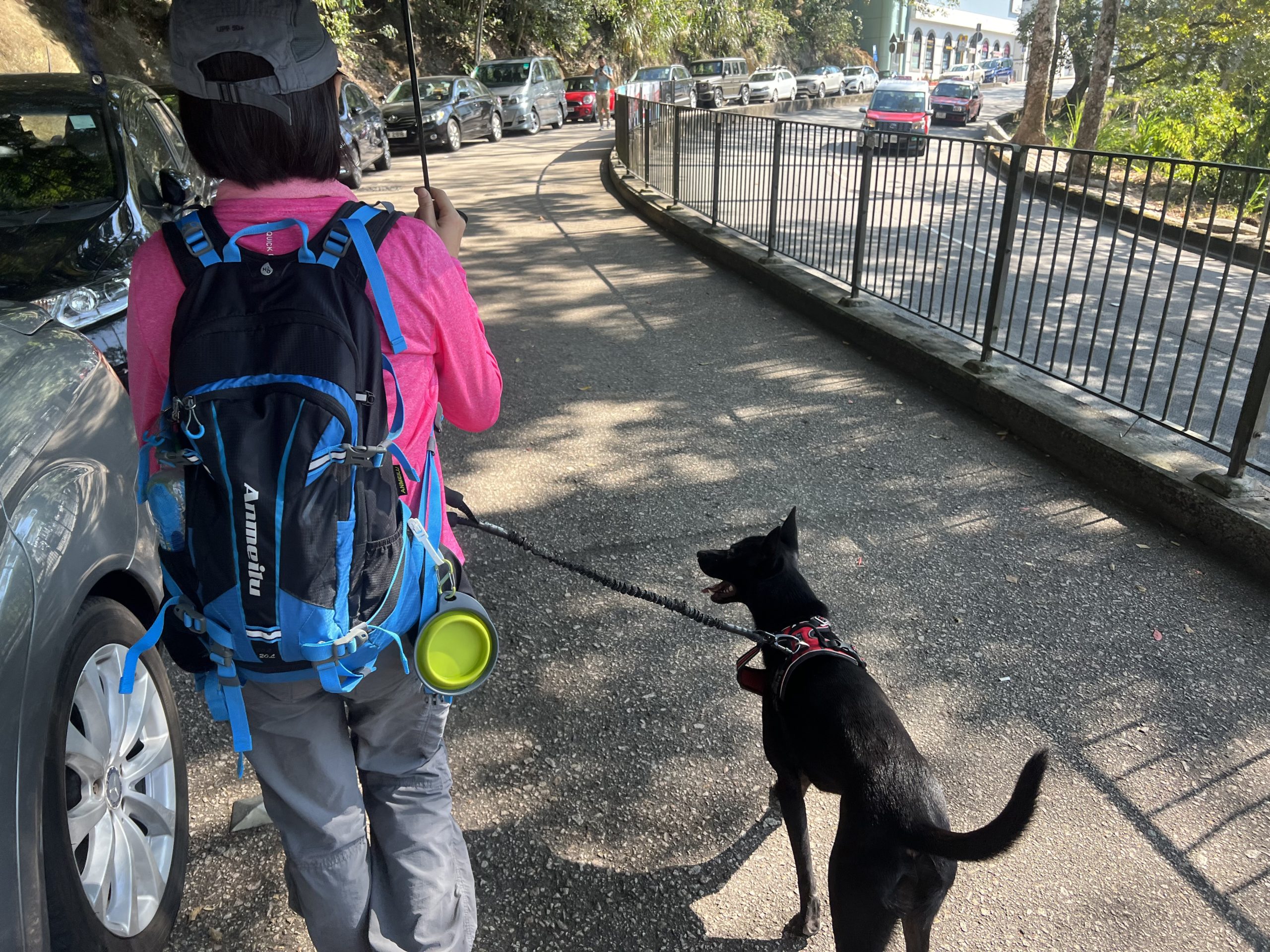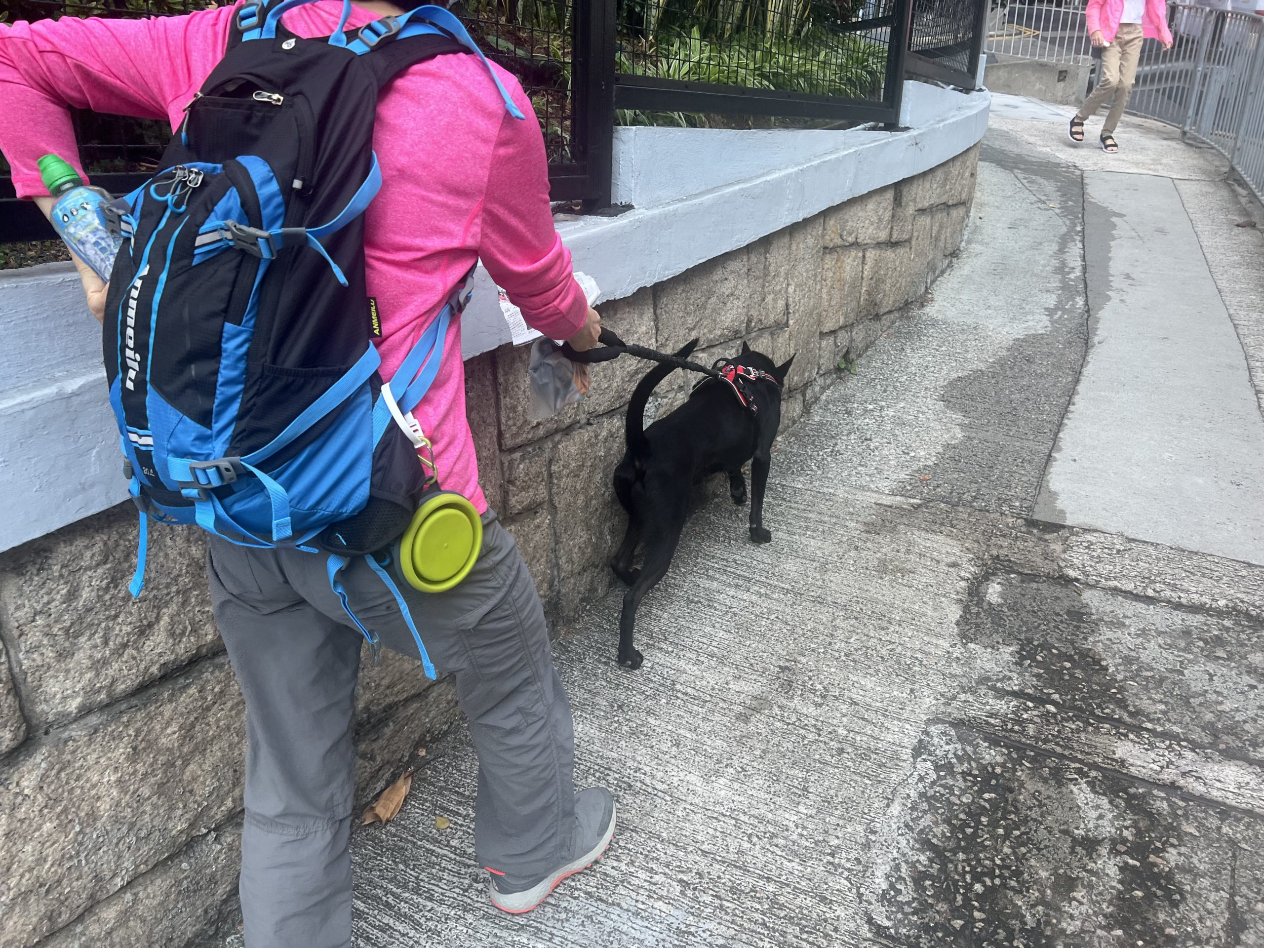 香港大部分的行山路線未有規範市民牽引20公斤以下的狗隻,Brenda到達行山徑範圍都會脫下狗繩,讓Veego自由走動,增加咟其他狗隻互動的機會。