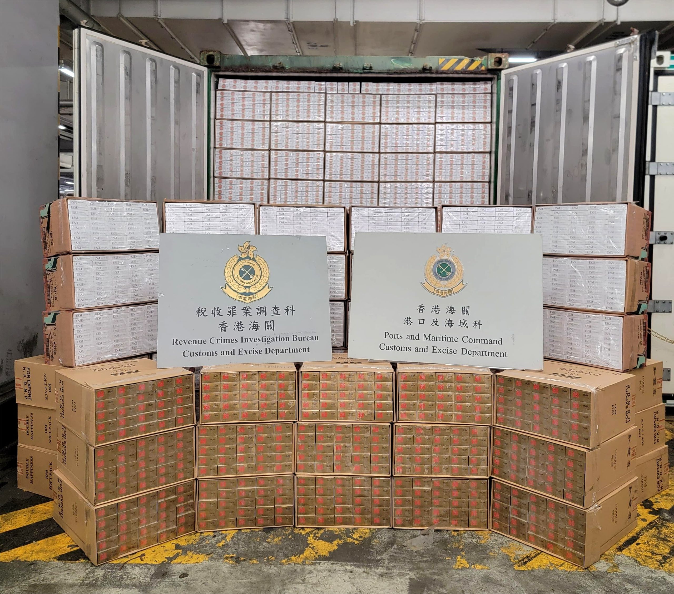 發言人說,在其中一宗案件,海關於上月29日透過風險管理和情報分析,在葵涌海關大樓驗貨場查驗一個從台灣抵港、報稱載有急凍食物的40呎貨櫃,在貨櫃內檢獲950萬支懷疑私煙。