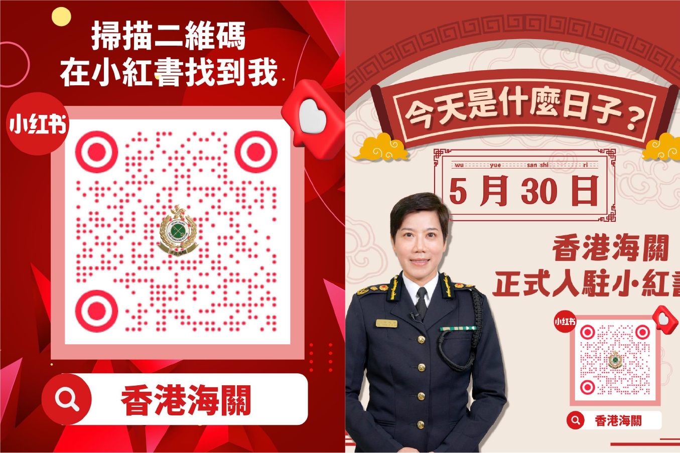 主圖片:海關今日以帳號「香港海關」正式登陸小紅書(圖左方有小紅書帳號二維碼),關長何珮珊特别為此拍攝宣傳短片作開通序幕。