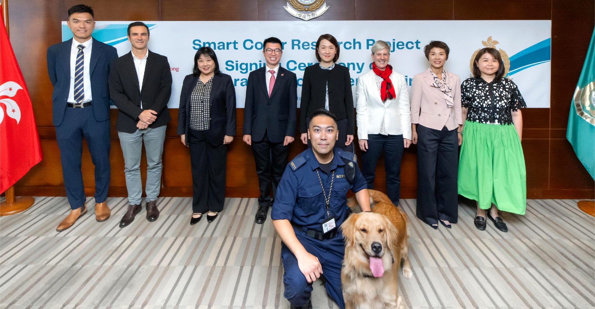 海關今日與香港城市大學簽署合作備忘錄,透過智能頸圈的數據研究和分析,提升搜查犬的執法成效。