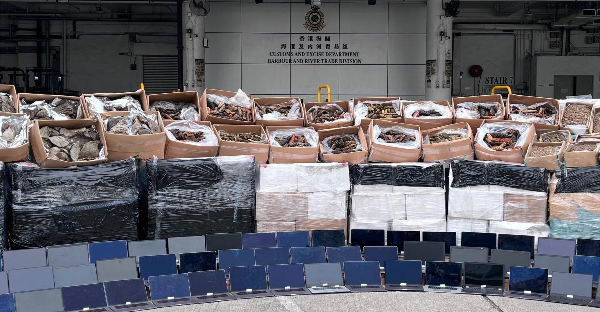 主圖片:海關檢獲的懷疑走私貨物,包括手提電腦、手提電腦零件、冰鮮豬肚、牛肉乾和冷藏海參 。