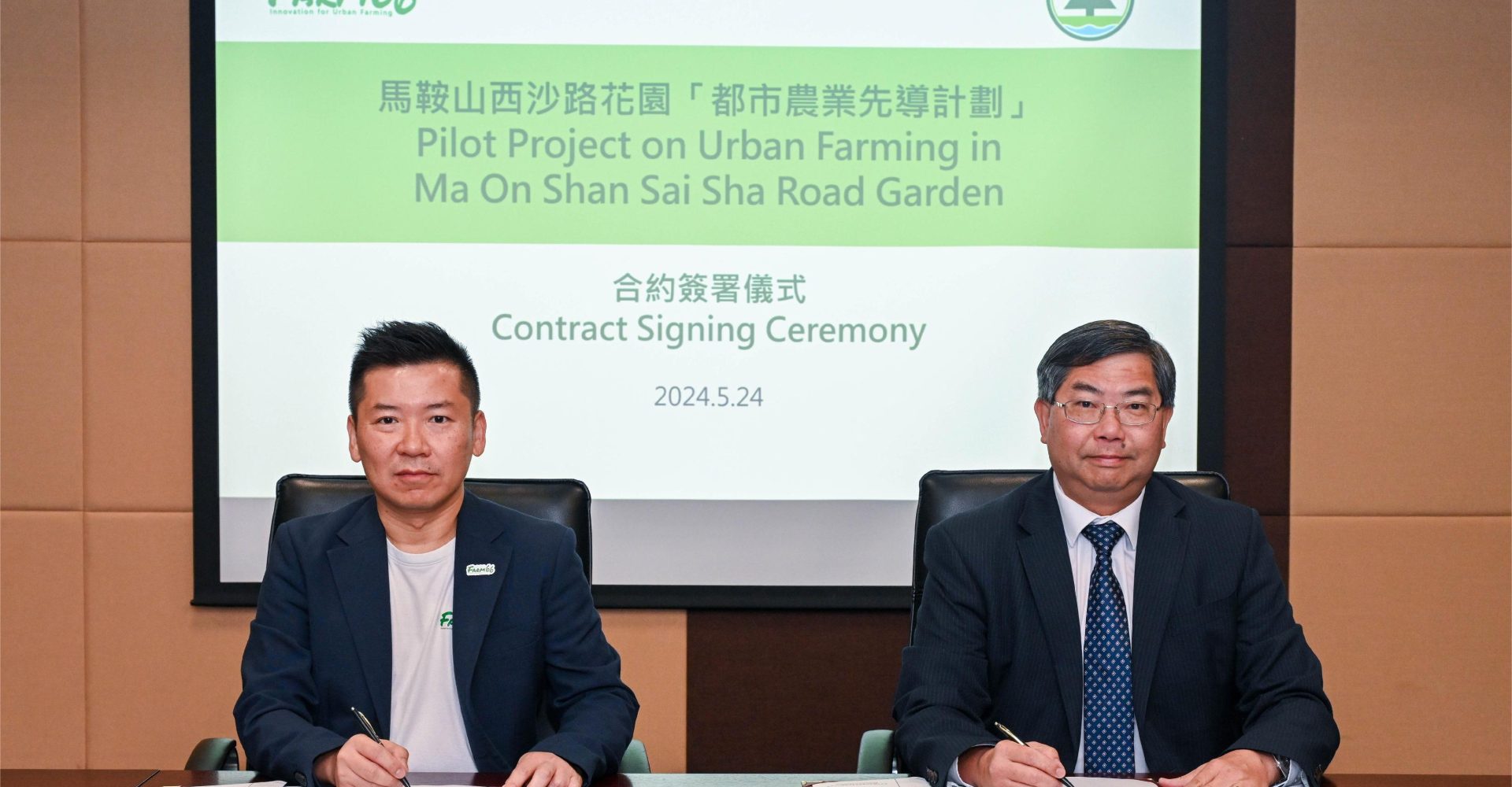 漁農自然護理署今日與綠芝園投資有限公司簽訂合約,在馬鞍山西沙路花園推行「都市農業先導計劃」,於花園內一個室內作物農場種植農產品。