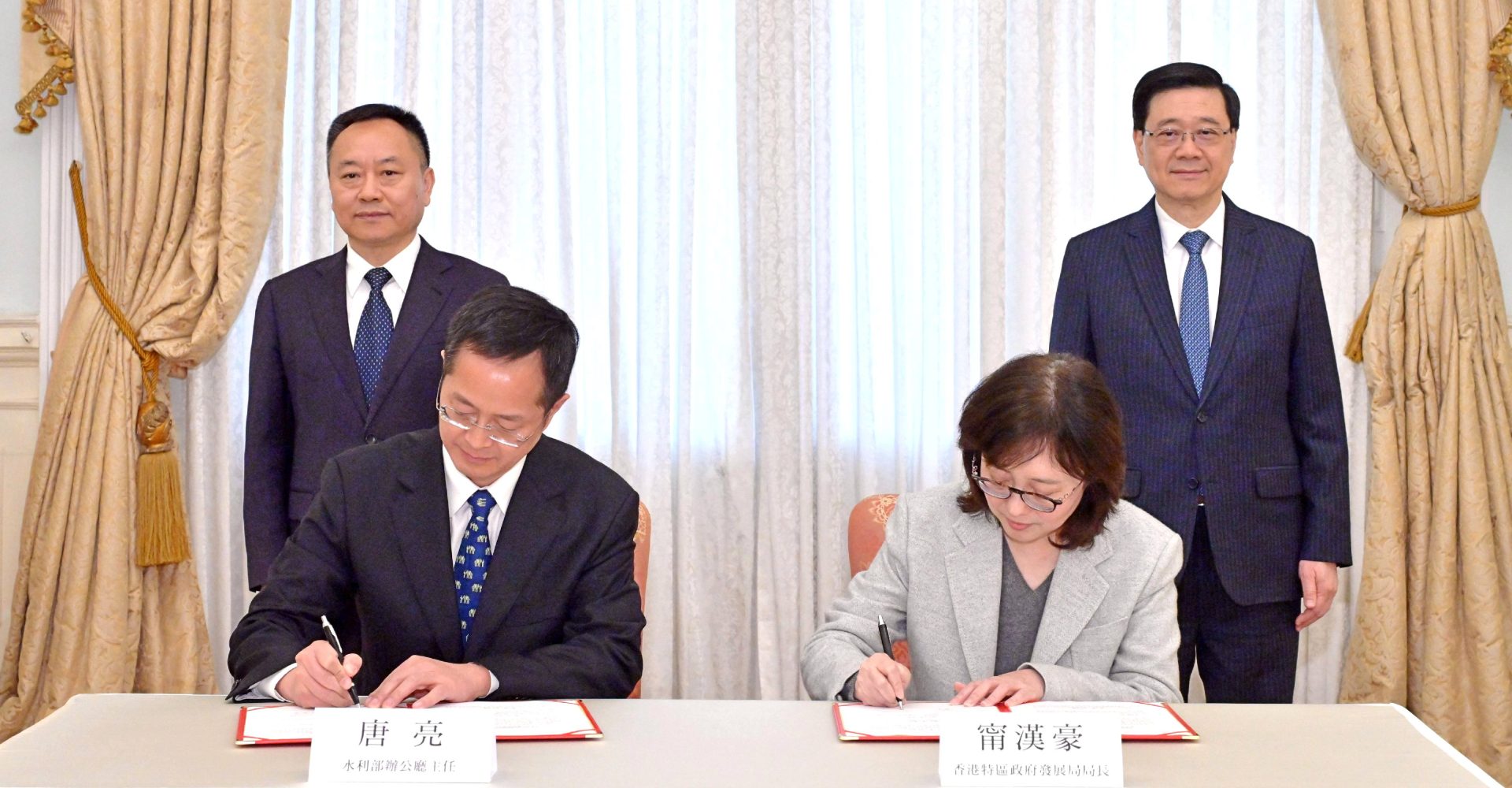 簽署儀式於禮賓府舉行,在行政長官李家超和水利部部長李國英見證下,由發展局局長甯漢豪和水利部辦公廳主任唐亮分別代表香港特區政府和水利部簽署。