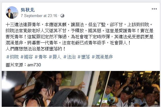 工聯會會長兼港區全國人大代表吳秋北,裁決當晚在Facebook發文,指終院法官「做老好人」,「縱其惡」。又說:「這幫罪犯定然不悔過,為社會埋下定時炸彈,其違法免受懲罰更是混淆是非,將毒害一代青年。法官老爺已成青年殺手,社會罪人!人們應想想法治是怎樣墮落的!」