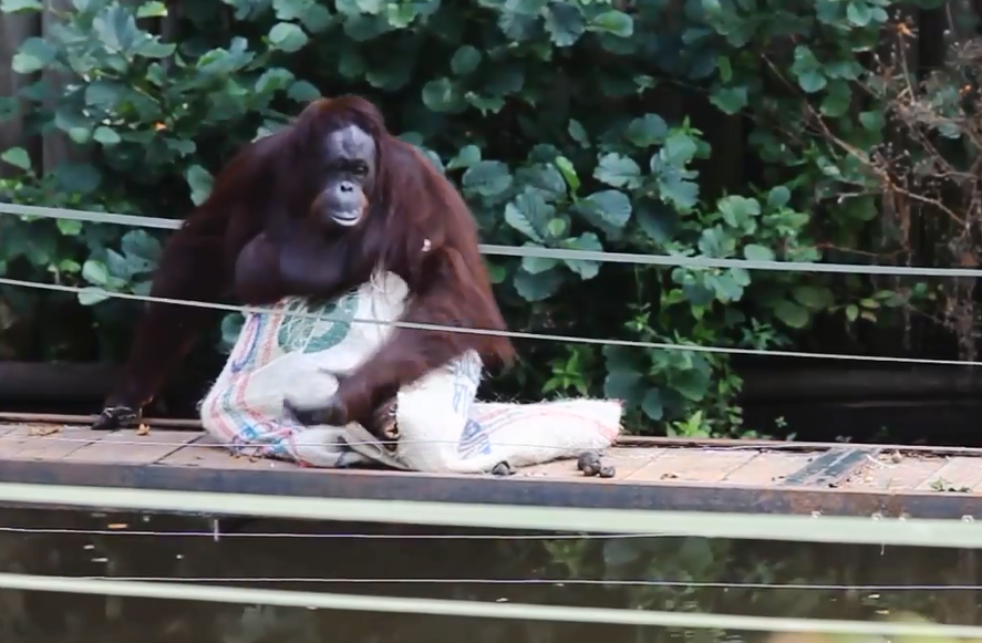 今年16歲的雌性婆羅洲紅毛猩猩Gambira ,是英國佩根頓動物園 ( Paignton Zoo ) 的動物明星,非常愛打扮。Gambira先將手放入裝咖啡豆的麻包袋,然後打開一個缺口,將頭伸出來。換上新裝後更向附近的猩猩同伴炫耀一番,更乖乖向遊客揮手拍照。