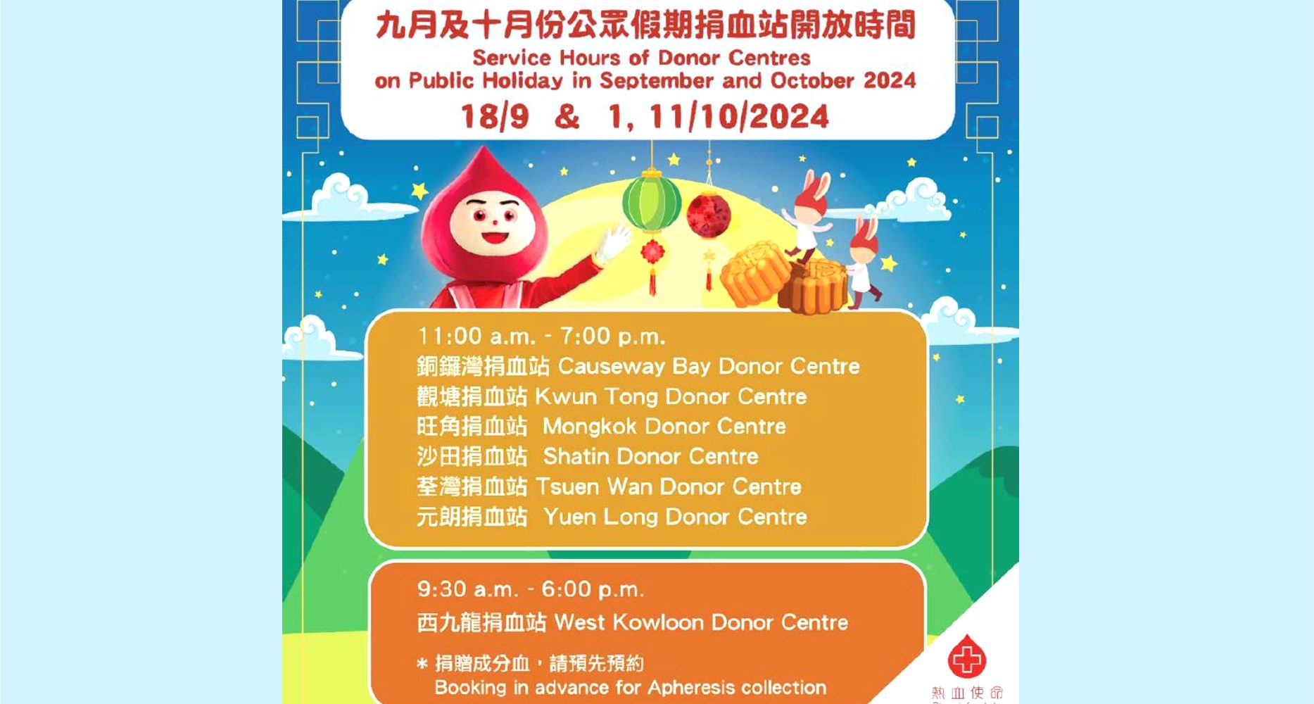 中心緊急呼籲市民盡快前來捐血,補充血庫,以確保病人得到適切的臨床輸血治療。「臨近中秋佳節及國慶假期,中心鼓勵市民踴躍捐血救人,為病友送上團圓的祝福。大部分捐血站在公眾假期照常開放。」
