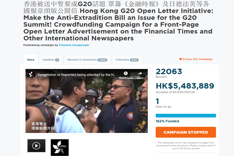 網上討論區「LIHKG」(俗稱連登)於週一發起眾籌行動,冀於G20峰會舉行前,在英、美、日、法、德等國報章刊登頭版廣告,向國際社會表明反修訂《逃犯條例》的信息。從眾籌專頁所見,截至今日下午4時15分,已有22062人捐款,籌得548萬港元,超過籌集300萬的目標。