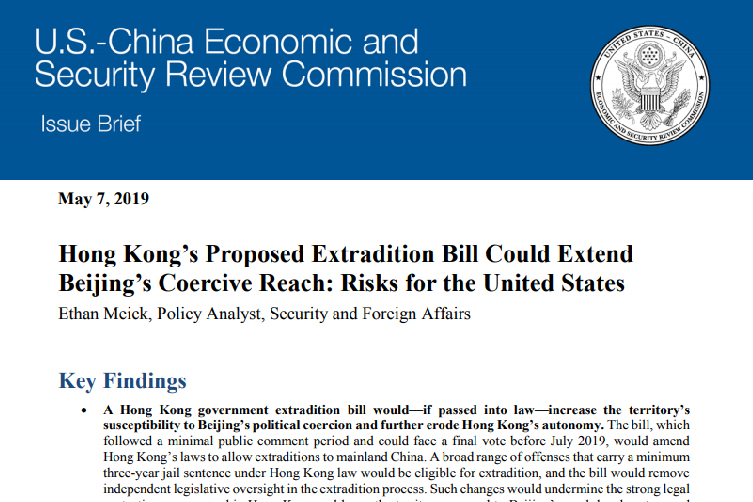《逃犯條例》修訂爭議持續,美國國會轄下的美中經濟與安全審查委員會就事件發表研究報告,指一旦《逃犯條例》修訂獲得通過,北京在香港的政治影響力將會擴大,更對美國國家安全和在香港的經濟利益構成極大風險。