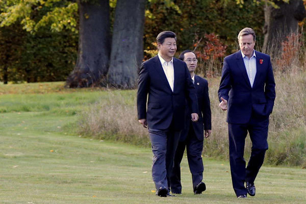 習近平下午離開白金漢宮,到達首相卡梅倫的鄉郊別墅進行會面,並共進晚餐,兩人會談了4個半小時,就治國理政、雙邊關係、國際形勢等問題深入交换意見。當中,雙方討論了包括香港和敘利亞等外交議題,而卡梅倫更要求習近平保證中央政府毋須對香港行政長官進行篩選,交由港人選出,並能繼續維持香港的高度自治權,給予最大的政治自由。