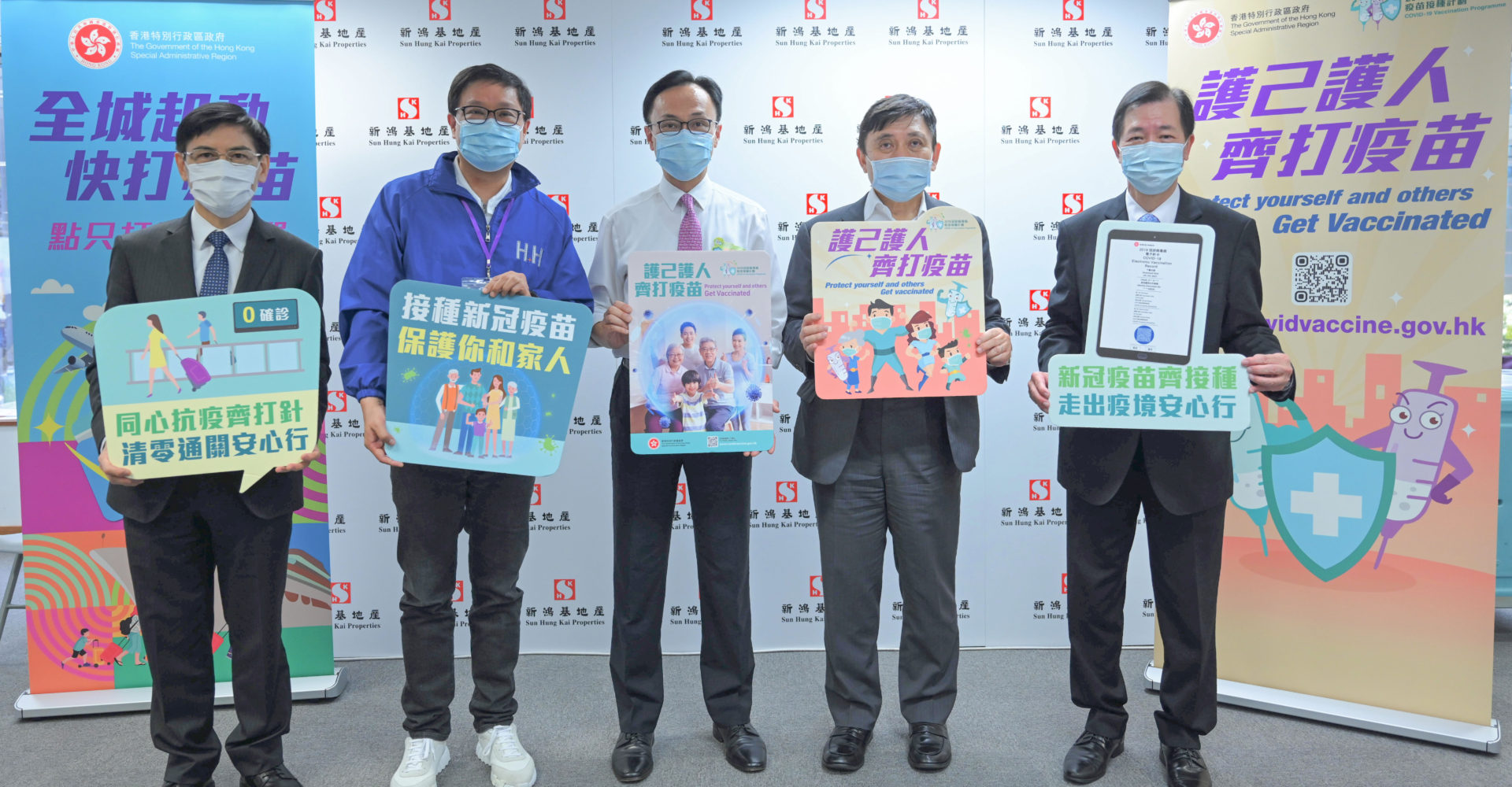 封面圖:公務員事務局局長聶德權(中)、新鴻基地產主席兼董事總經理郭炳聯(右二)、康業控股主席及行政總裁鄺正煒(左一)、新鴻基地產公共事務總監李鑾輝(右一)、何文田體育館社區疫苗接種中心代表(左二)。