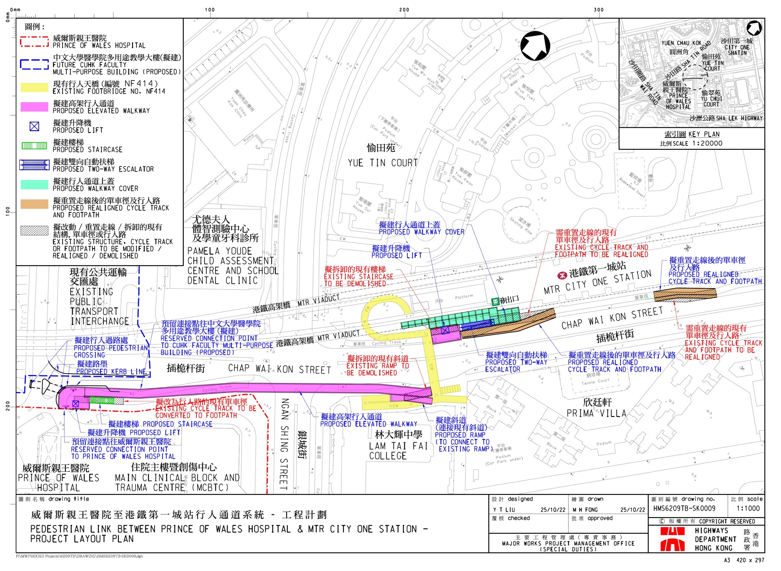 工程計劃並包括在B出口外的行人路興建約60米長、3 – 6米闊的行人通道上蓋,連接行人通道系統,以及在威院住院主樓暨創傷中心外的插桅杆街行人路,建造淨闊度2米的樓梯及一部升降機。