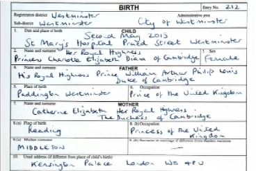 身份證上顯示,小公主的全名是「Her Royal Highness Princess Charlotte Elizabeth Diana of Cambridge」(劍橋公主夏洛特.伊利沙伯.戴安娜殿下),父親威廉王子是「His Royal Highness Prince William Arthur Philip Louis Duke of Cambridge」(劍橋公爵威廉.阿瑟.菲臘.路易斯王子殿下),職業是「英國王子」;母親凱蒂則是「Catherine Elizabeth Her Royal Highness The Duchess of Cambridge」(劍橋公爵夫人.嘉芙蓮.伊麗莎白殿下),職業是「王妃」。而小公主亦正式成為英國王位第四位繼承人。