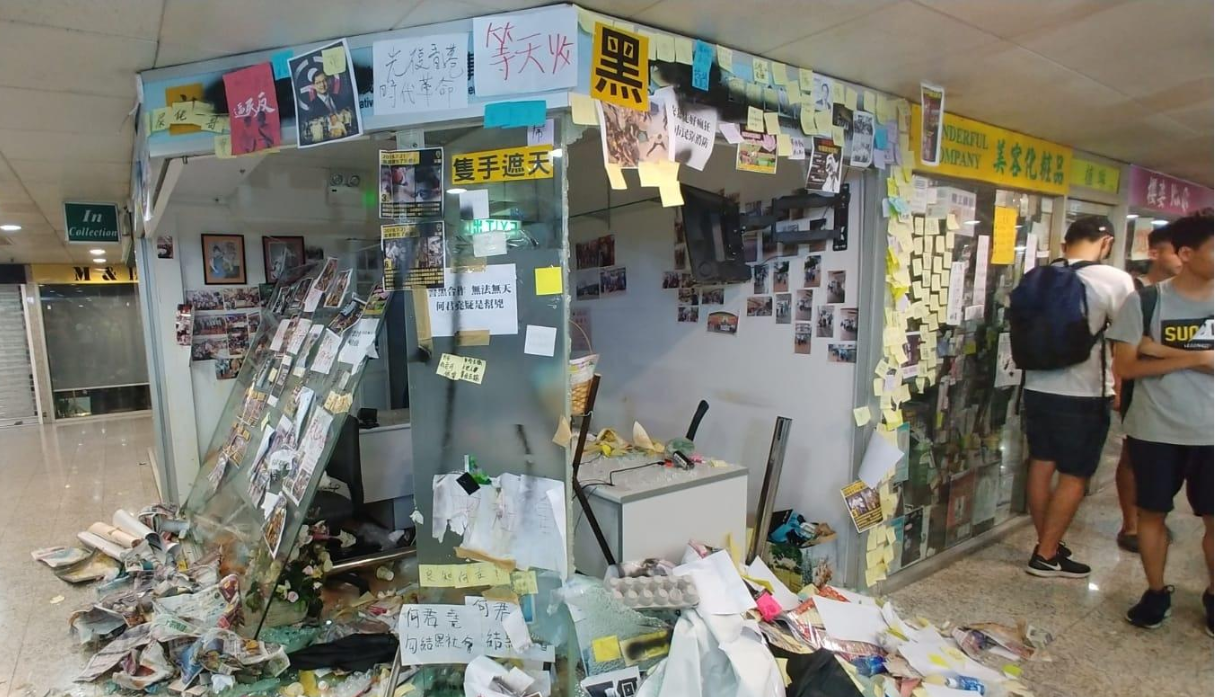 立法會議員何君堯於荃灣荃豐中心的辦事處於7月22日遭市民包圍抗議,辦事處玻璃遭撞破塌下,閉路電視被拆除。何君堯事後在社交網站指責有一群黑衣暴徒受荃灣區區議員譚凱邦煽惑,破壞他的辦事處。他於昨日入禀區域法院控告譚凱邦,要求賠償損失。