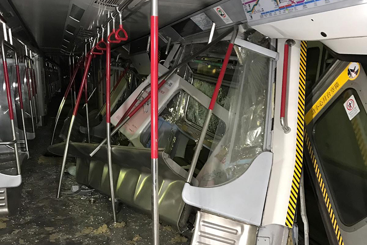 港鐵在今天凌晨測試荃灣線新信號系統期間,中環站附近有兩列列車相撞,開往中環站方向的列車,事發後車頭損毀,而另一列前往荃灣站方向的列車,第三及第四車卡損毀。根據港鐵發放的圖片,其中一列列車的車頭右邊撞毀,車身輕微傾斜,而另一架列車車身嚴重損毀,其中一節車廂整排座位飛脫、扶手跌落,車門變形,車廂內滿布零件碎片。事發後,其中一名車長腳部擦傷送院。