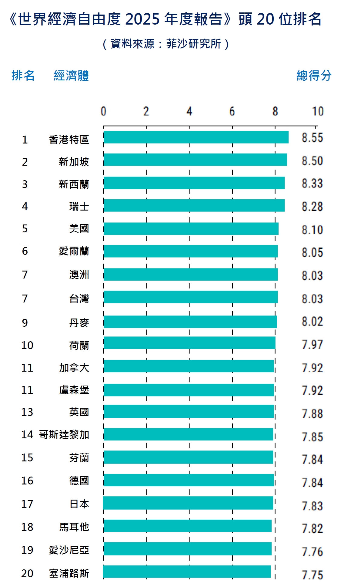 菲沙研究所的2025年報告,是根據所能獲得的最新數據,即2023年的數據,定出2025年的排名。