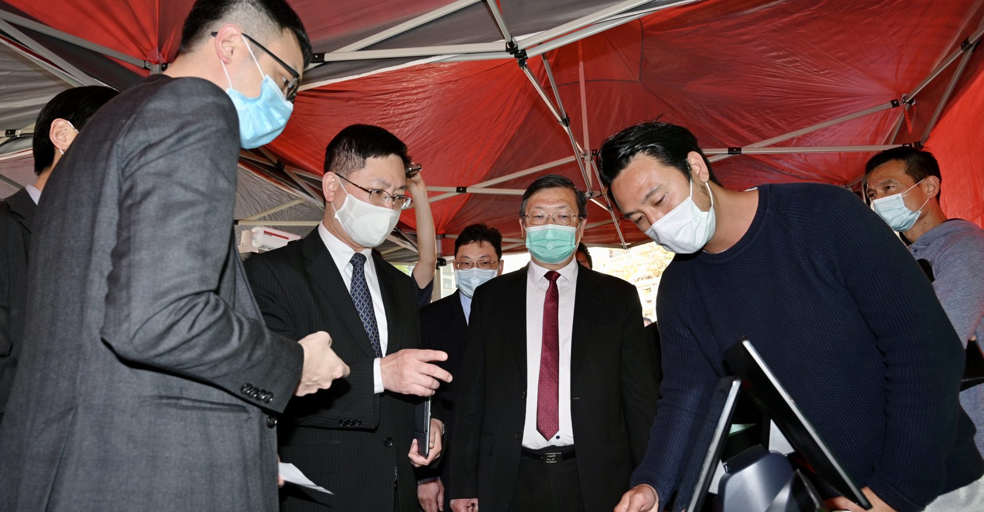 封面圖:創新及科技局局長薛永恒(左二)聽取機電工程署署長彭耀雄(右二)介紹年花銷售點監察人流系統。