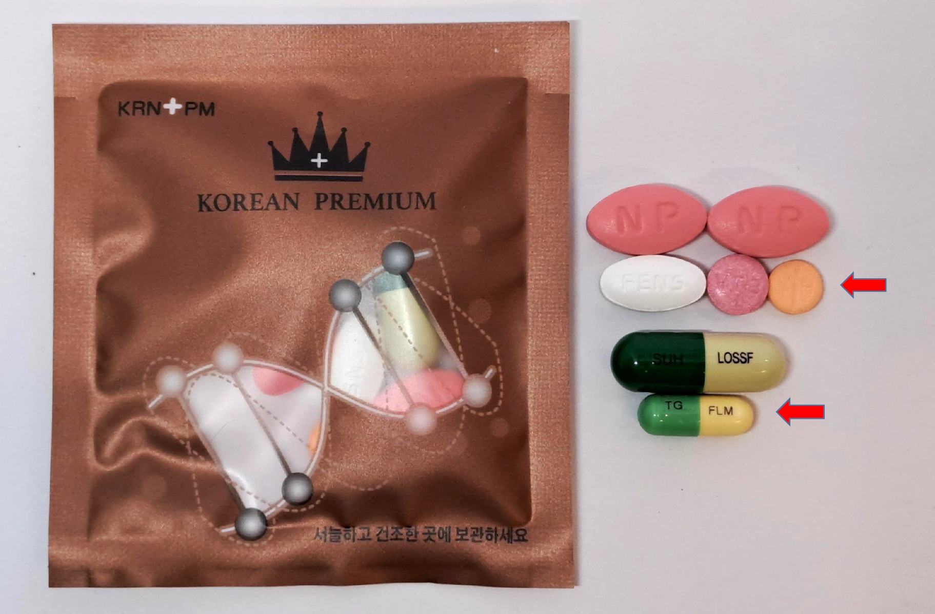 衞生署發言人表示,該署根據情報,於較早時透過即時通訊軟件,購獲一款紙盒包裝上印有英文「KOREAN PREMIUM」及「KRN+PM」的減肥產品(見上圖),內有30個密封包裝袋,每個密封包裝袋內含七顆藥丸和膠囊。產品包裝上有以韓文顯示有關產品可能源自韓國。
