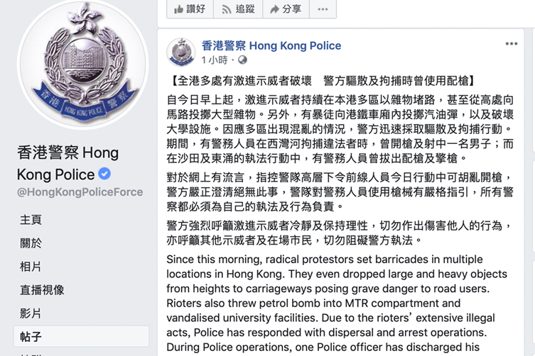 本港多區今日(11日)響應網上「三罷」號召,有示威者堵路影響交通。警方在社交平台證實,警方今早在西灣河拘捕違法者時曾開槍及射中一名男子,亦有警員在沙田及東涌的執法行動中,曾拔出配槍及擎槍,呼籲激進示威者冷靜及保持理性,切勿作出傷害他人的行為,亦呼籲其他示威者及在場市民,切勿阻礙警方執法。