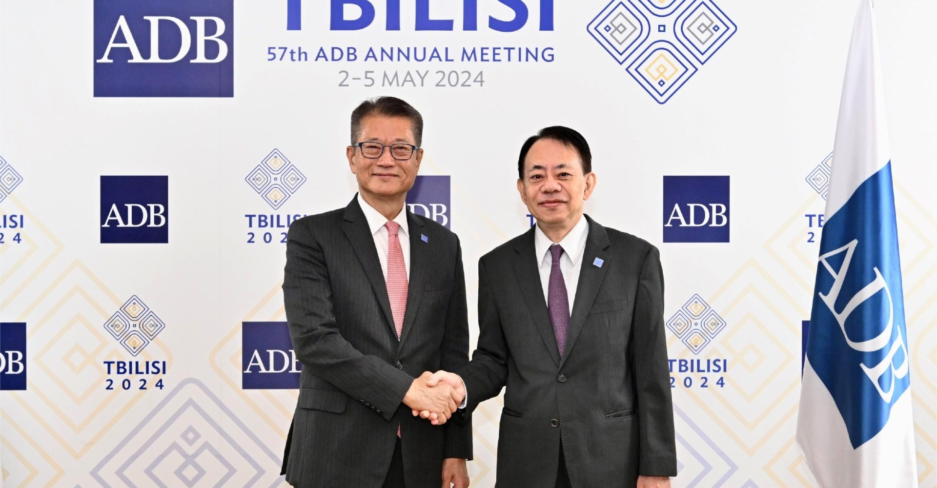 正在達格魯吉亞出席亞洲開發銀行年會的財政司司長陳茂波,與亞開行行長淺川雅嗣會面,就區域綠色轉型、氣候融資、基建項目建設,以及加強中國香港與亞開行之間的合作等議題,交換意見。