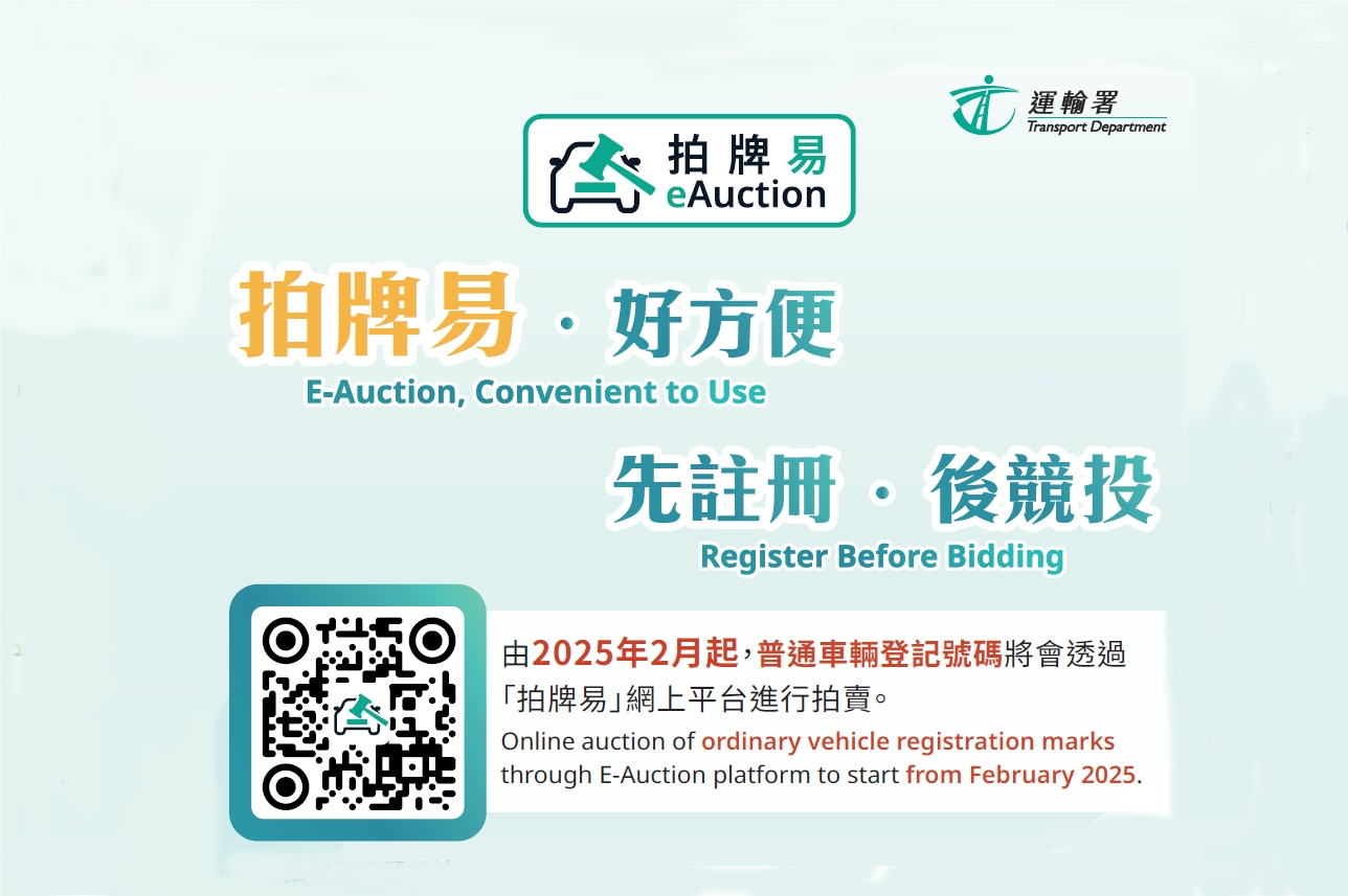 運輸署今日推出「拍牌易」網上普通車牌號碼拍賣平台 e-auction.td.gov.hk。有意競投人士預先註冊成為用戶後,便可透過電腦或流動裝置不受地域限制競投車牌號碼。至於以「HK」或「XX」為字首的車牌號碼、特殊車牌號碼和自訂車牌號碼,則會繼續沿用現場舉牌競投方式拍賣。