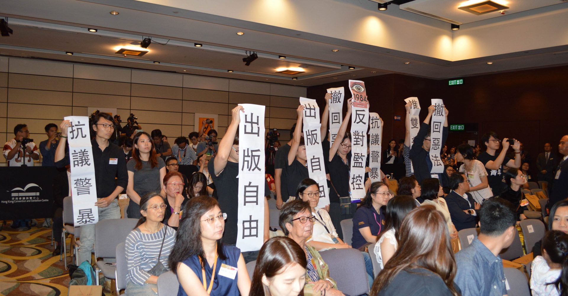 一批青年作者下午在會展舉行的第二屆香港出版雙年獎頒獎禮上,向正在致詞的商務及經濟發展局局長邱騰華高舉「出版自由」和「撤回惡法」等標語。會場保安人員在場戒備,事件中並無衝突發生。