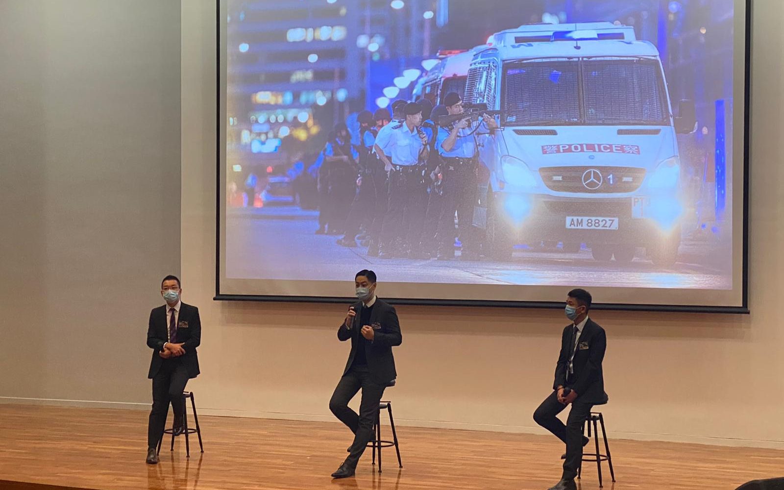 警察公共關係科總警司郭嘉銓(圖中)介紹警方宣傳片,由導演林超賢的製作團隊以「友情價」接拍,只有一間公司投標,因製作過程涉及不少商業機構,不可公開合約資料,現階段亦不能透露具體金額。他表示,製作費符合政府既定程序,亦有內部審計,將會向立法會財委會交代成本,確保公帑用得其所。