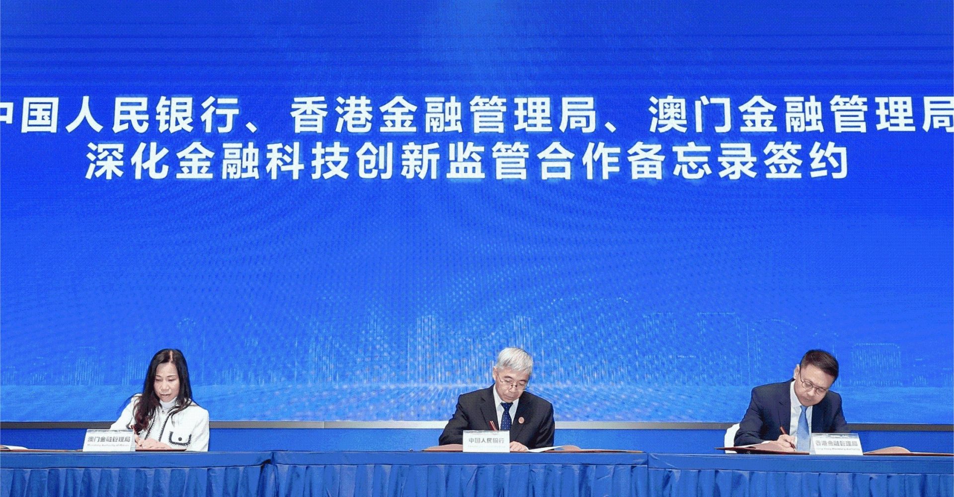 主圖片:中國人民銀行副行長張青松(中)、香港金管局助理總裁(銀行監理)陳景宏(右)和澳門金管局行政管理委員會委員劉杏娟(左)於本月8日,在北京成方金融科技論壇上簽署《關於在粵港澳大灣區深化金融科技創新監管合作的諒解備忘錄》。