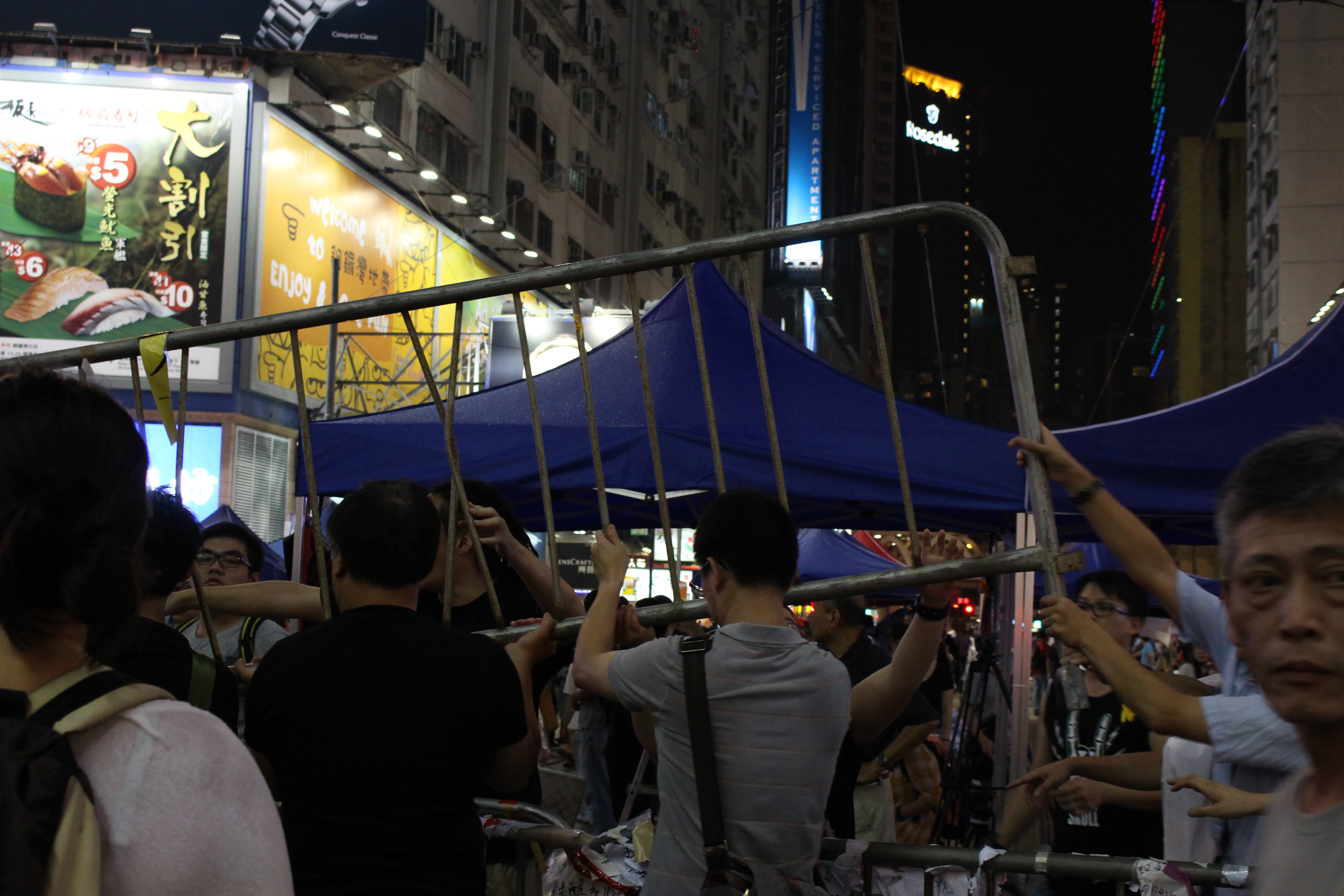 專題報道社會議題 銅鑼灣路障移走再重設 October 4, 201401170 【集會直擊】十月三日銅鑼灣現場(攝影:陳蕾蕾 ) 【6:57pm】 作為路障的鐵馬被移除,並由貨車運走,吸引大批市民圍觀及喝倒彩。 【7:10pm】 銅鑼灣站E出口出現大批警察 【7:27pm】集會人士重設路障 【7:45pm】崇光百貨大門落閘 銅鑼灣警方築成人牆封路 攝影:張啟俊 Related Related tags : 佔領銅鑼路障集會直擊 滋事份子見人就打 警方沒拘捕 Previous Post 「愛字頭」踩場辣火頭 旺角警民大衝突(有片) Next Post
