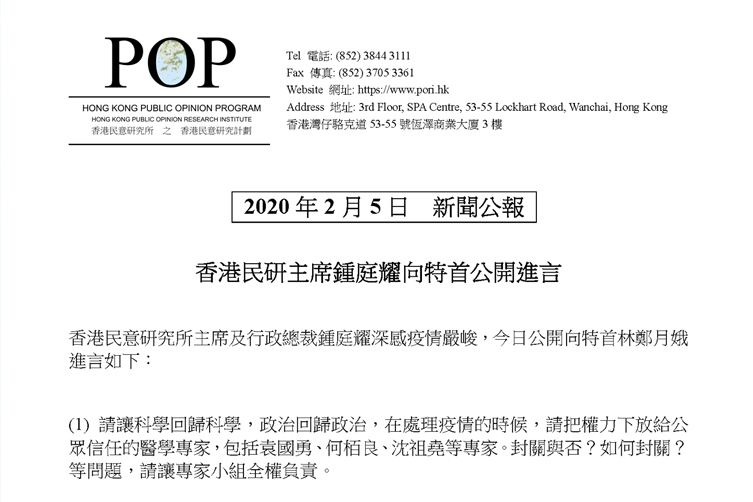 新型冠狀病毒肺炎疫情持續,醫管局員工陣線要求全面封關而發起的罷工行動進入第三日,特首林鄭月娥至今仍堅拒全面封關。香港民意研究所主席及行政總裁鍾庭耀向林鄭月娥發出公開信,希望特首可下放權力予公眾信任的醫學專家,例如袁國勇、何栢良、沈祖堯等,由專家小組全權負責應否封關等事宜。