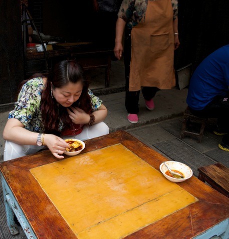 由於有很人都是附近民眾,那些小食顯然非常地道,當日天氣頗熱,幾個大漢一邊吃著碗裡的麻辣麵皮,一邊拼命擦汗,有人更索性打起赤膊吃個痛快。