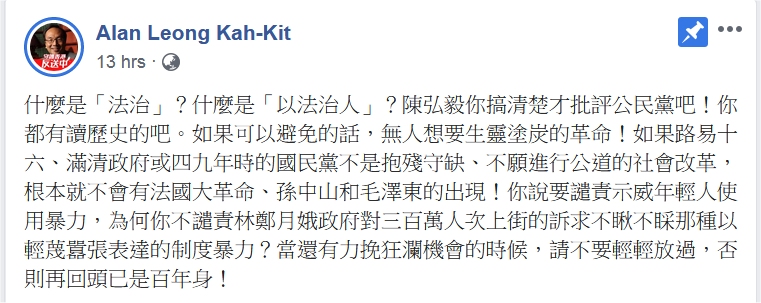 公民黨立席梁家傑在陳弘毅發表貼文後約3小時,在Facebook作出回應,批評陳沒有搞清楚「法治」和「以法治人」的分別。