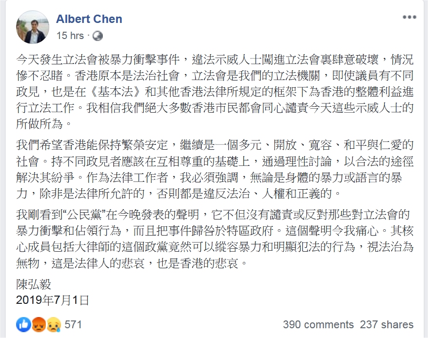香港大學法律學院教授兼基本法委員會委員陳弘毅,昨晚在示威者衝入立法會大樓約2小時後在Facebook發表貼文,批評示威者的行為「違反法治、人權和正義」;又指公民黨在發表的聲明中沒有讉責暴力行為,「視法治為無物」,是「法律人的悲哀」。
