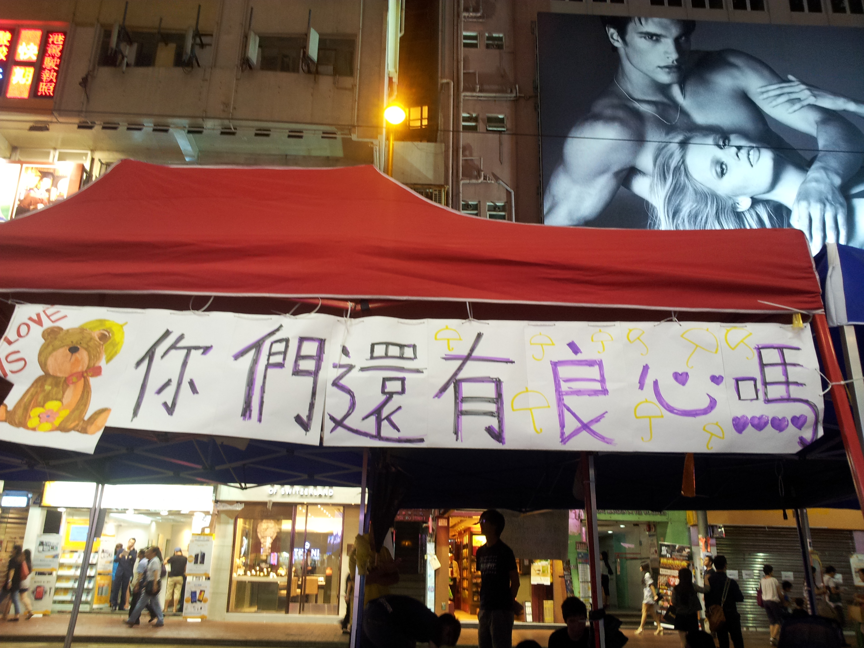 大家爭取普選,要求民主,都建基於尊重人權,重視民意,沒有民意支持的特首,我們不要。但佔領者在該區進行的集會,設置路障阻塞交通,對該區居民帶來不便,影響生計,我們可有尊重過他們?可有做過民意調查,願意犠牲的人多,還是反對的聲音多?縱使只是一小撮人,便不應受到尊重?所謂的籌碼,就是該區的居民和商戶,他們有權反對嗎?支持普選不一定支持「佔中」,反對「佔中」的人也不等於抗拒民主。在銅鑼灣的集會廣場上,掛着一張「你們還有良心嗎?」的橫額,反對佔中反對集會的人就是沒良心?良心的定義是甚麼?守護社區,希望回復秩序,他們就是憑良心來反對。