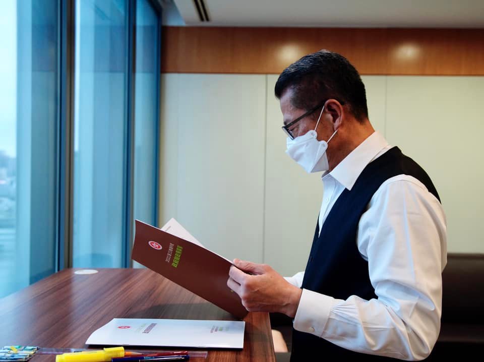 (陳茂波Facebook專頁圖片:陳茂波就公布財政預算案作最後準備)