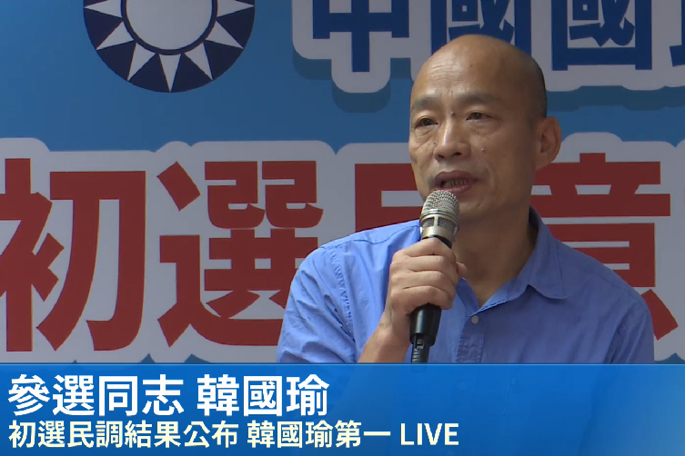 國民黨今日(15日)公布黨內總統初選民調結果,高雄市市長韓國瑜以44%支持率勝出國民黨內總統初選,預料將代表國民黨出戰明年總統大選,挑戰競逐連任的民進黨現任總統蔡英文。