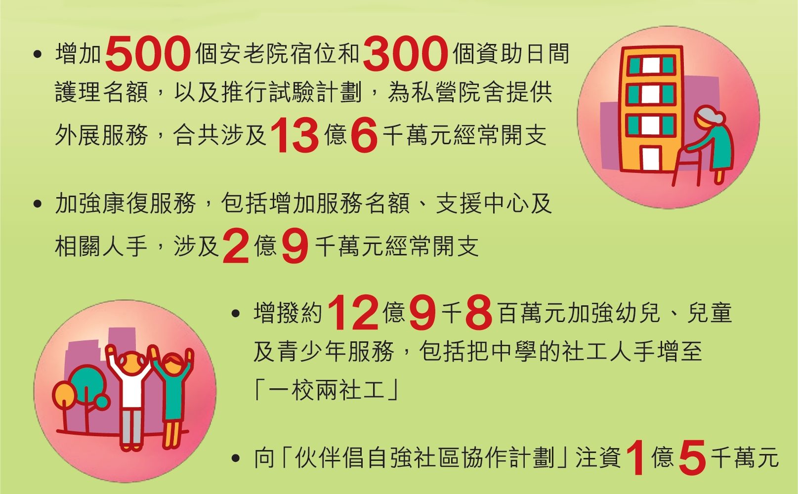 政府在未來兩年預計會額外提供超過500個安老宿位,以及300個資助長者日間護理服務名額。另外,政府剛推出為期4年的試驗計劃,為私營安老院舍約4.5萬名院友,提供包括社工及物理治療師等專業團隊外展服務,用於推行新措施的額外經常開支約13.6億元。