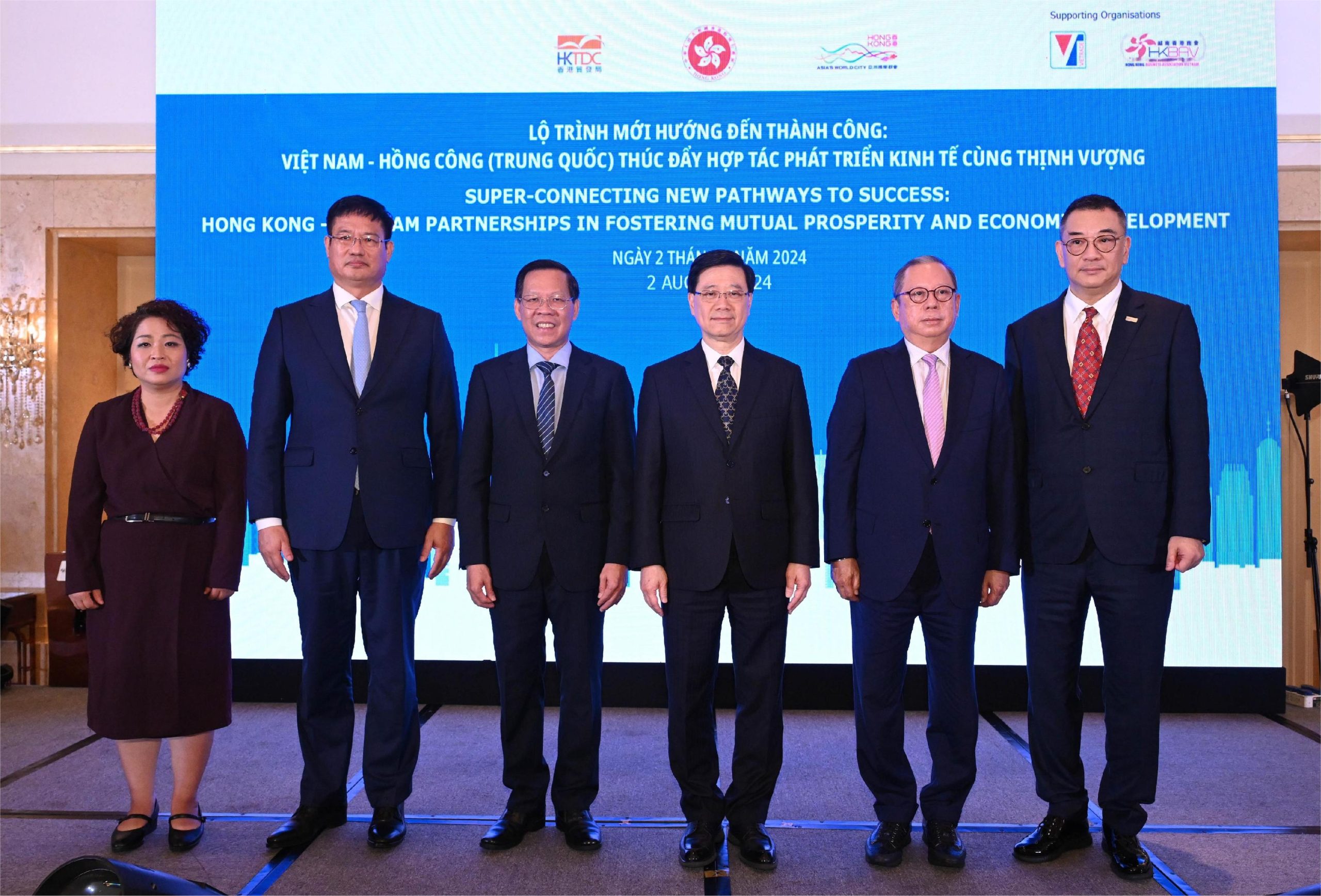 主圖片:李家超(中間左)與胡志明市委副書記阮湖海(中間右)會面。財政司副司長黃偉綸(左三)、商務及經濟發展局局長丘應樺(左二),以及其他官員亦有出席。
