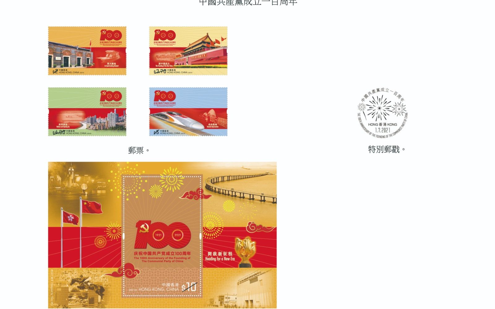 香港郵政宣布,於七月一日發行以「中國共產黨成立一百周年」為題的紀念郵票及相關郵品。