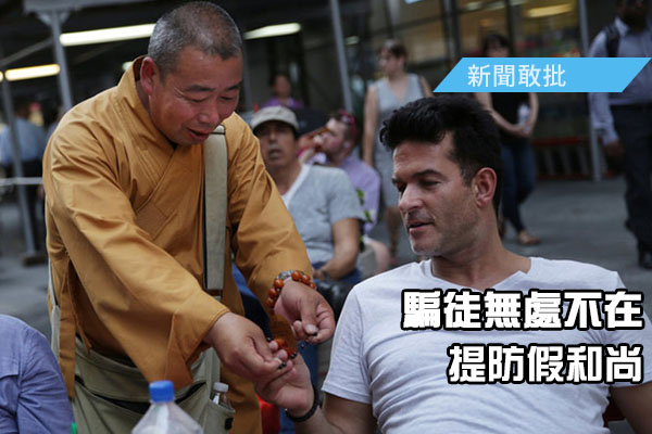 近日有報章揭發深圳有商店售賣假僧服,有可能就是經常在街上見到和尚的原因。報導指,大埔墟一名穿僧服的光頭中年男子,拉起易拉架向途人推銷「驚世神書」小冊子。記者觀察一輪後,發覺當途人圍觀時,一名婦人就會現身光顧,然後「和尚」會贈送佛珠,途人見到當然「唔執輸」,紛紛付款購買。這名婦人來回多次買書,更向途人指和尚是內地得道高僧,並加以游說「二十元就可趨吉避凶」,騙子當然袋袋平安。