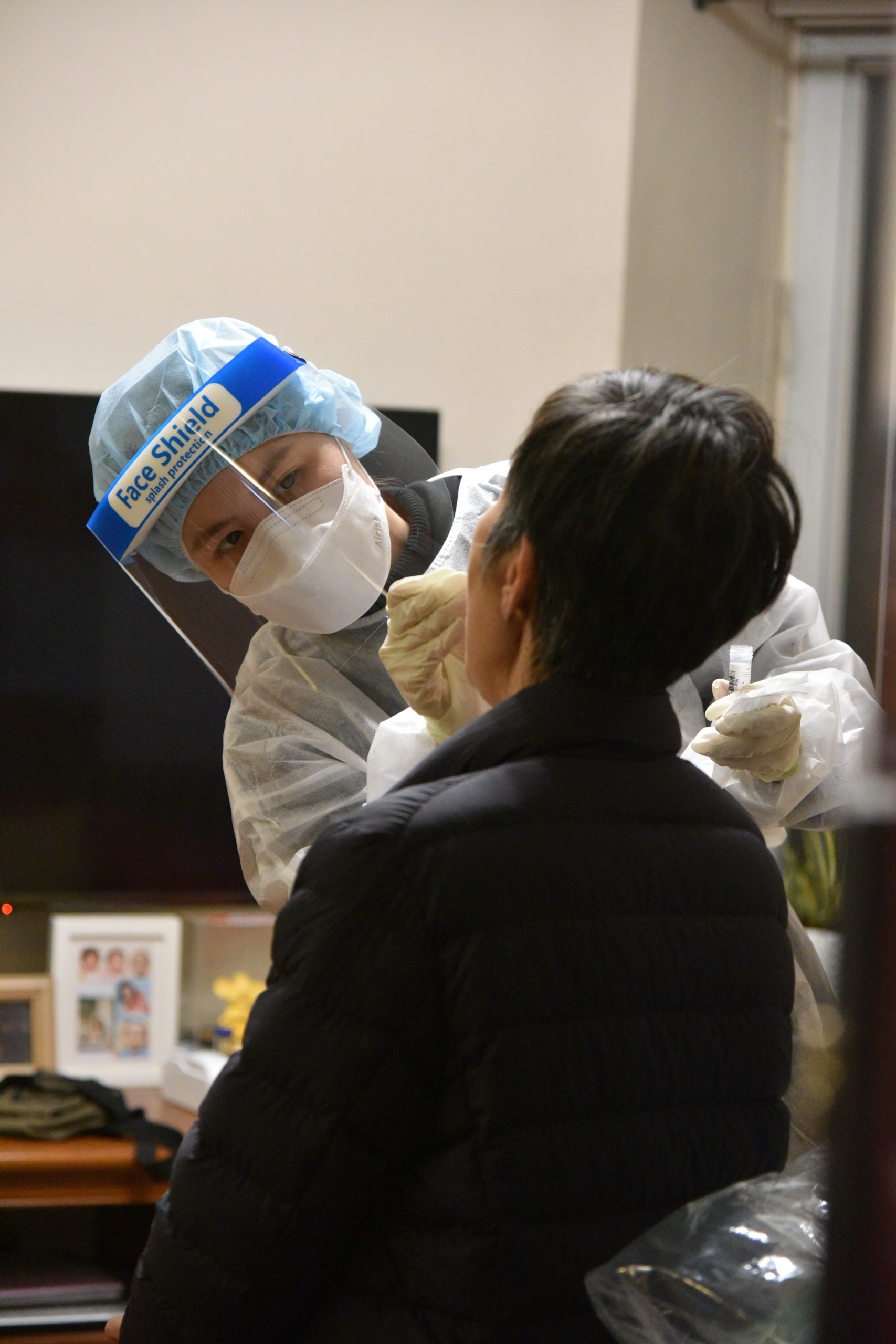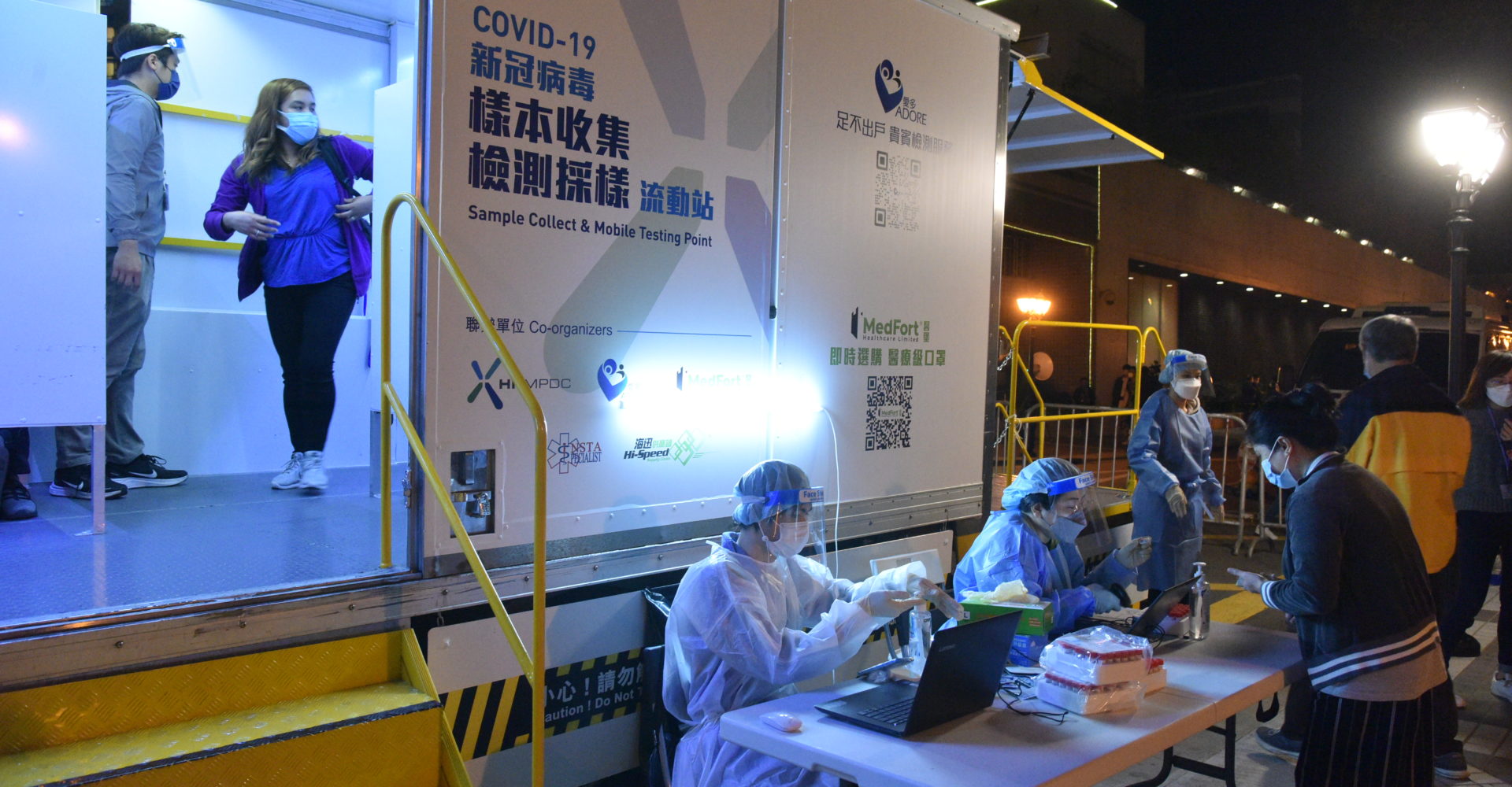 (圖片來源:政府新聞處/封面圖:工作人員在麗港城「受限區域」內為居民登記檢測。)