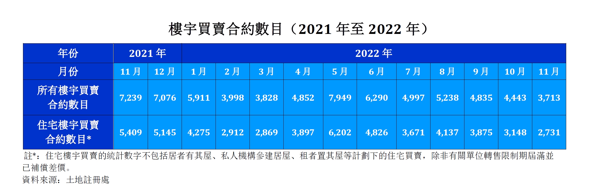 社會新聞編輯推介財經 11月份住宅樓宇買賣合約數目創本年新低 December 2, 20220814 根據土地註冊處數字,11月份住宅樓宇買賣合約只有2,731份,創本年新低。 之前買賣合約最低的月份是3月,有2,869份。(見下表) 11月份住宅樓宇買賣合約數目與10月份比較,下跌13.2%,與去年同期比較大幅下跌49.5%。 如計算所有樓宇的賣買合約,11月份有3,713份,較10月下跌16.4%,與去同期比較也大幅下跌48.7%。 圖片來源:新傳網資料圖片 Related 特首及主要官員在中聯辦設置的靈堂弔唁已故前國家主席江澤民 Previous Post 【專訪】陳德霖:求知慾助適應時代變化 Next Post