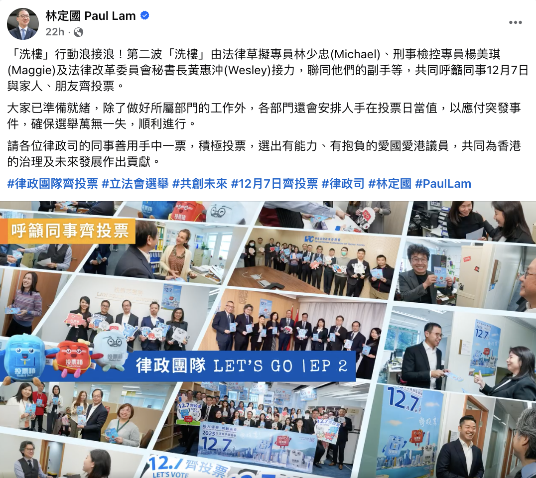 另外,律政司司長林定國在社交平台表示,各部門會安排人手在投票日當值,以應付突發事件,確保選舉萬無一失,順利進行。林定國呼籲律政司的同事善用手中一票,積極投票,選出有能力、有抱負的愛國愛港議員,共同為香港的治理及未來發展作出貢獻。