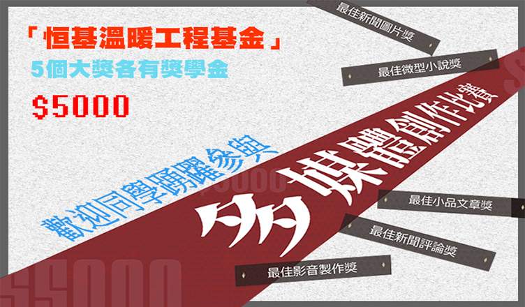每天,我們身邊都發生許多大大小小的事情,有影響全球的國際大事,有與我們息息相關的社會議題,縱使一部電影、一本小說也可能讓我們有所感悟。為鼓勵同學們透過寫作、攝影、短片,把課堂上學到的東西實踐,把所知所學的作品上載至《新傳網》供大眾閱讀,《新傳網》特設五個獎項,每項均可獲$5,000「恒基溫暖工程基金」獎學金。