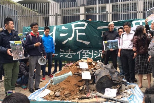 【本網訊】土地正義聯盟成員昨帶同多袋由鄉郊收集的2噸泥頭,遊行到政府總部,堆起小山丘,抗議當局對鄉郊土地遭非法倒泥執法不力。大批軍裝警員在現場戒備,警告示威者若不清走泥頭,會以《公眾衞生及市政條例》檢控,最終警方無拘捕任何人士,有關部門其後亦派人清走泥頭。