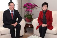 林鄭月娥先後拜會中聯辦、外交部駐港特派員公署及解放軍駐港部隊3個中央駐港機構。拜會中聯辦,林鄭月娥指是禮節性拜訪,雙方會面更長達一個半小時。中聯辦亦罕有地打開大閘,讓記者可以清楚拍攝張曉明與林鄭月娥握手的場面。