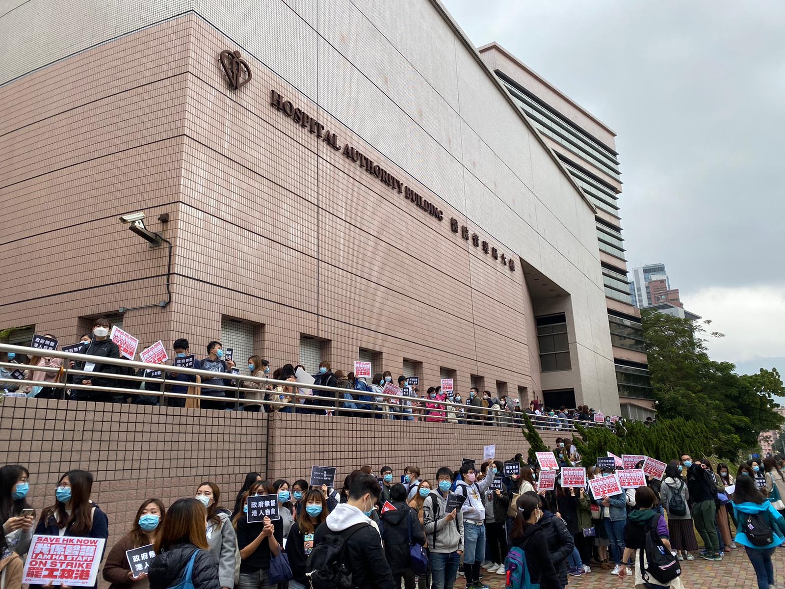 在第二階段的罷工日,早上有大批醫護人員排隊進入九龍城醫管局大樓遞請願信,促請政府「全面封關」。